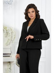 Жакет полуприлегающего силуэта, из костюмной ткани, с центральной бортовой застежкой на 2 петли и 2 пуговицы, с воротником пиджачного типа. Длина жакета по среднему шву спинки для размеров р.46-52 - 57 см; для размеров р.54-62 – 60 см, от шва втачивания воротника в горловину. Перед с нагрудной вытачкой уходящей к низу жакета. В нижней части переда расположены накладные карманы закруглённой формы. Спинка со средним швом, в нижней части которого расположена щлица. Рукава втачные, двухшовные. По низу рукава в локтевом шве обработана имитация шлицы с 3-мя пуговицами. Длина рукавов 59 см. Жакет на подкладке, с плечевыми накладками.