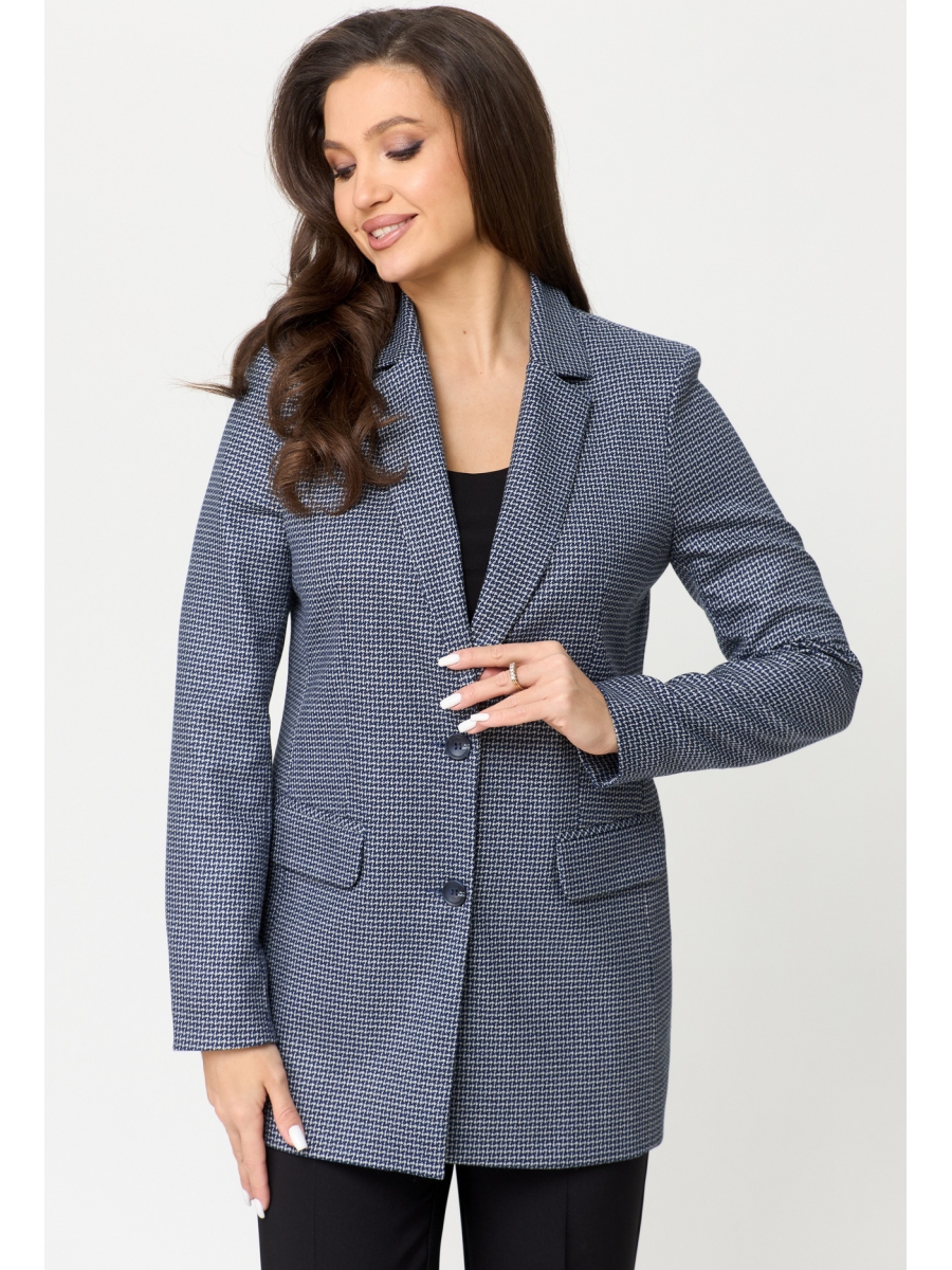 Жакет женский удлиненный, из текстильной ткани, полуприлегающего силуэта с центральной бортовой застежкой на пуговицы до линии перегиба лацкана. По переду имеется отрезной бочок и вертикальные вытачки. С прорезными карманами с клапаном и двумя обтачками. Спинка цельная. Воротник пиджачного типа. Рукав двухшовный, втачной.