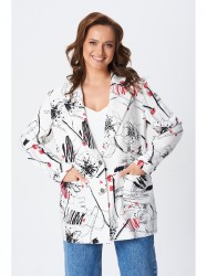 Жакет женский свободного покроя без подкладки. По переду центральная застежка на петли и пуговицы, воротник с лацканом пиджачного типа, вертикальный рельеф от проймы, нагрудная вытачка от горизонтального подреза ниже уровня линии талии, накладные функциональные карманы. Спинка со средним швом. Рукав втачной двухшовный длинный с отворотом по низу. Жакет выполнен из натуральной ткани с принтом, эластан в составе дает изделию дополнительный комфорт.