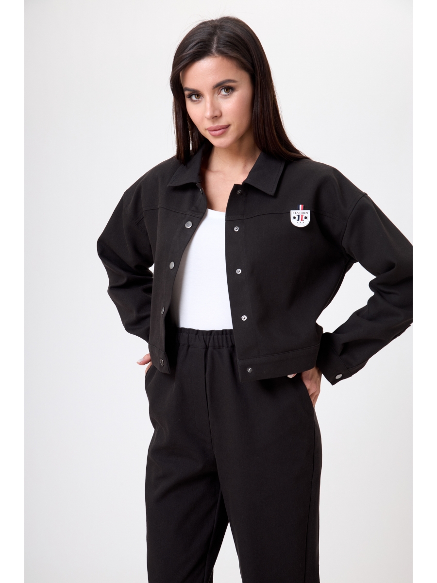 Джут короткий, до талии. Рукав длинный с манжетам. Застежка по переду на кнопки. Горловина обработана воротником. Спинка декорирована планкой на кнопках. Универсальная вещь в гардеробе каждой модницы, актуальна вне зависимости от сезона. Джут 961 черный снят с брюками 1131 и майкой 1015 Anelli Laurel.