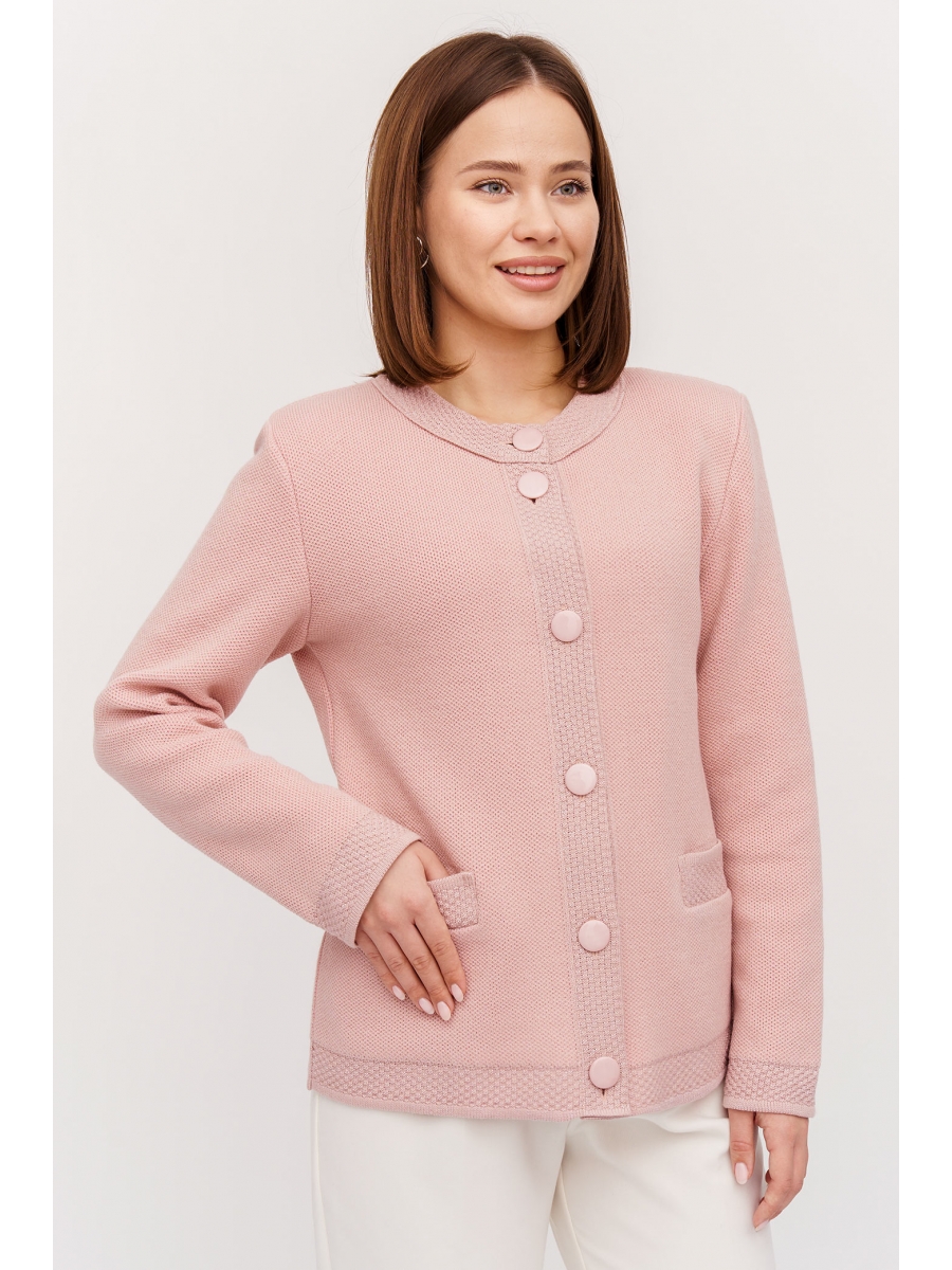 Жакет женский вязаный полуприлегающего силуэта в классическом стиле. Горловина круглая, застежка на пуговицы. По бокам два прорезных кармана с листочкой. Рукава втачные длинные. Отделка жакета выполнена структурной вязкой с добавлением люрекса