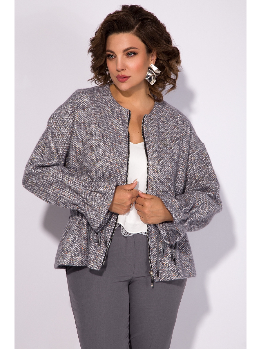 Стильный укороченный жакет по типу «бомбера» из твидовой рогожки! Модель силуэта «Oversize» со спущенной линией плеча. Рукав вточной, длинный. Горловина округлой формы на планке. Застежка центральная на металлическую молнию. По талии и низу рукава расположена кулиска с регулировкой приталенности. Спинка прямая.