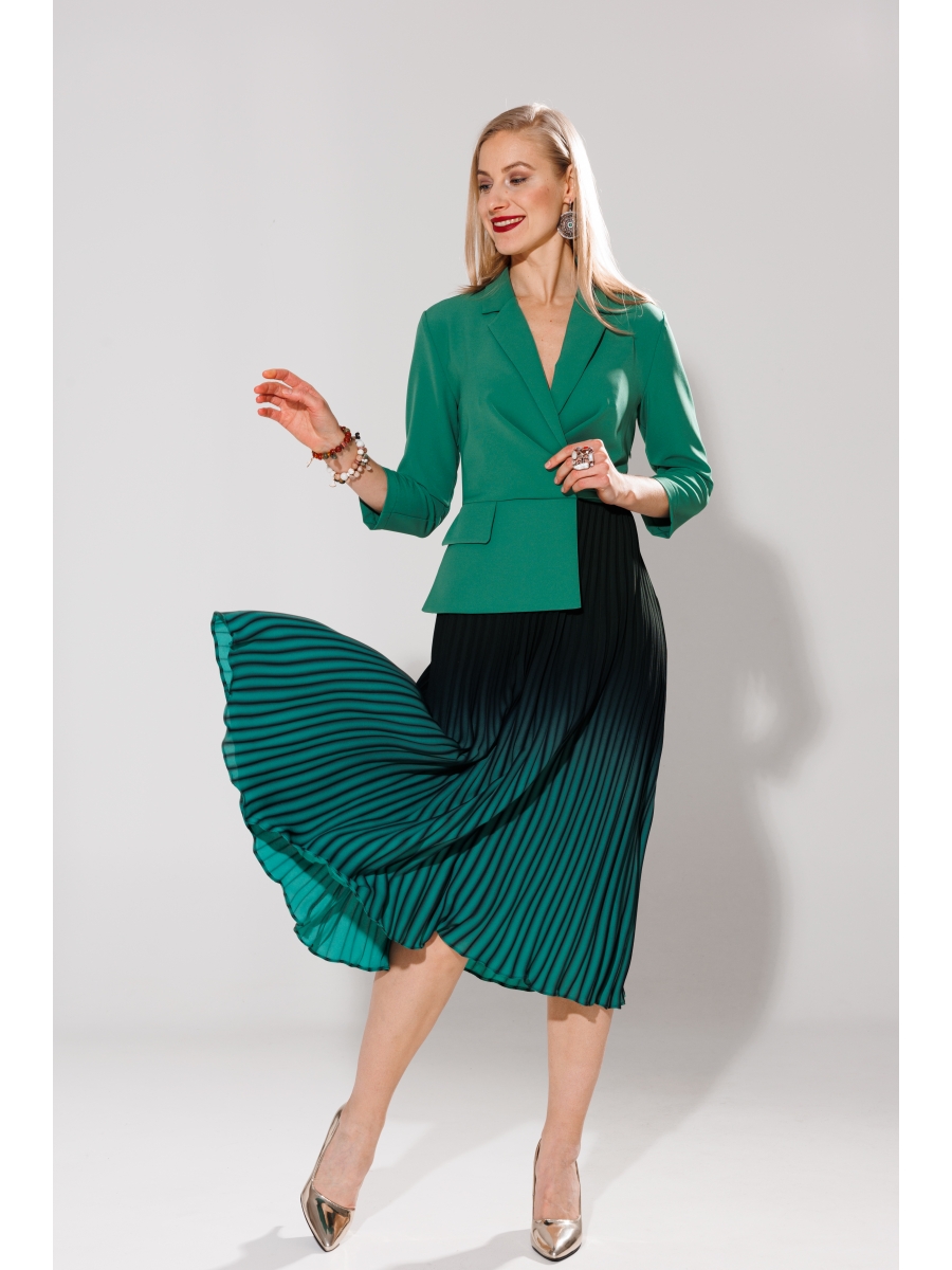 Платье женское прилегающего силуэта,расклешенное к низу. По переду платья нагрудные складки, воротник пиджачного типа,застежка с имитацией запаха. С переди по талии отдельная фигурная баска с клапаном. Спинка со средним швом и талиевыми вытачками. Рукав одношовный 7/8.