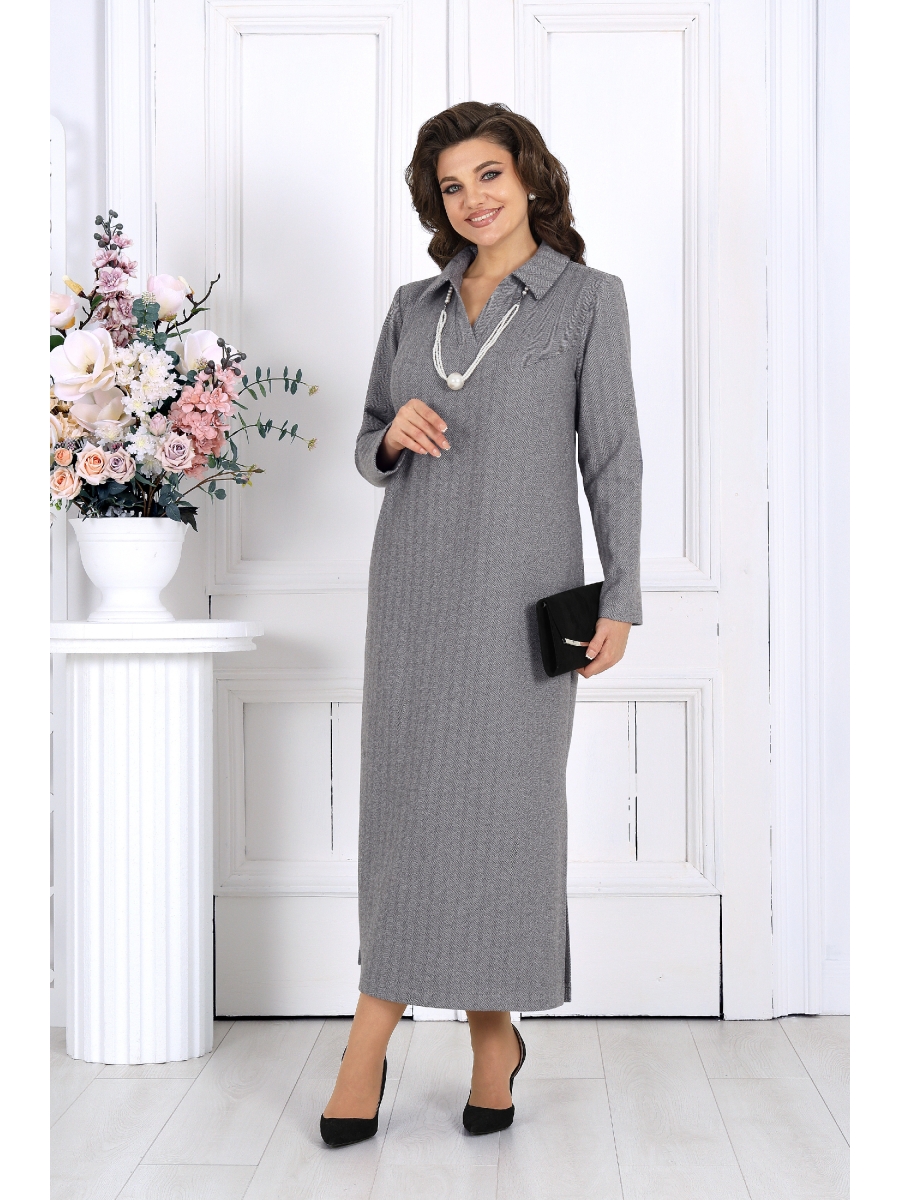Платье женское, прямого силуэта, расширенное к низу, выполнено из трикотажного полотна. Платье женское прямого силуэта, длиной по среднему шву спинки 124 см, от шва втачивания воротника. Перед платья с нагрудными вытачками из проймы. Спинка со средним швом. В боковых швах обработаны карманы и разрезы. Воротник рубашечного типа, по переду планка «поло». Рукав втачной, одношовный, длиной 60 см. Платье без подкладки.