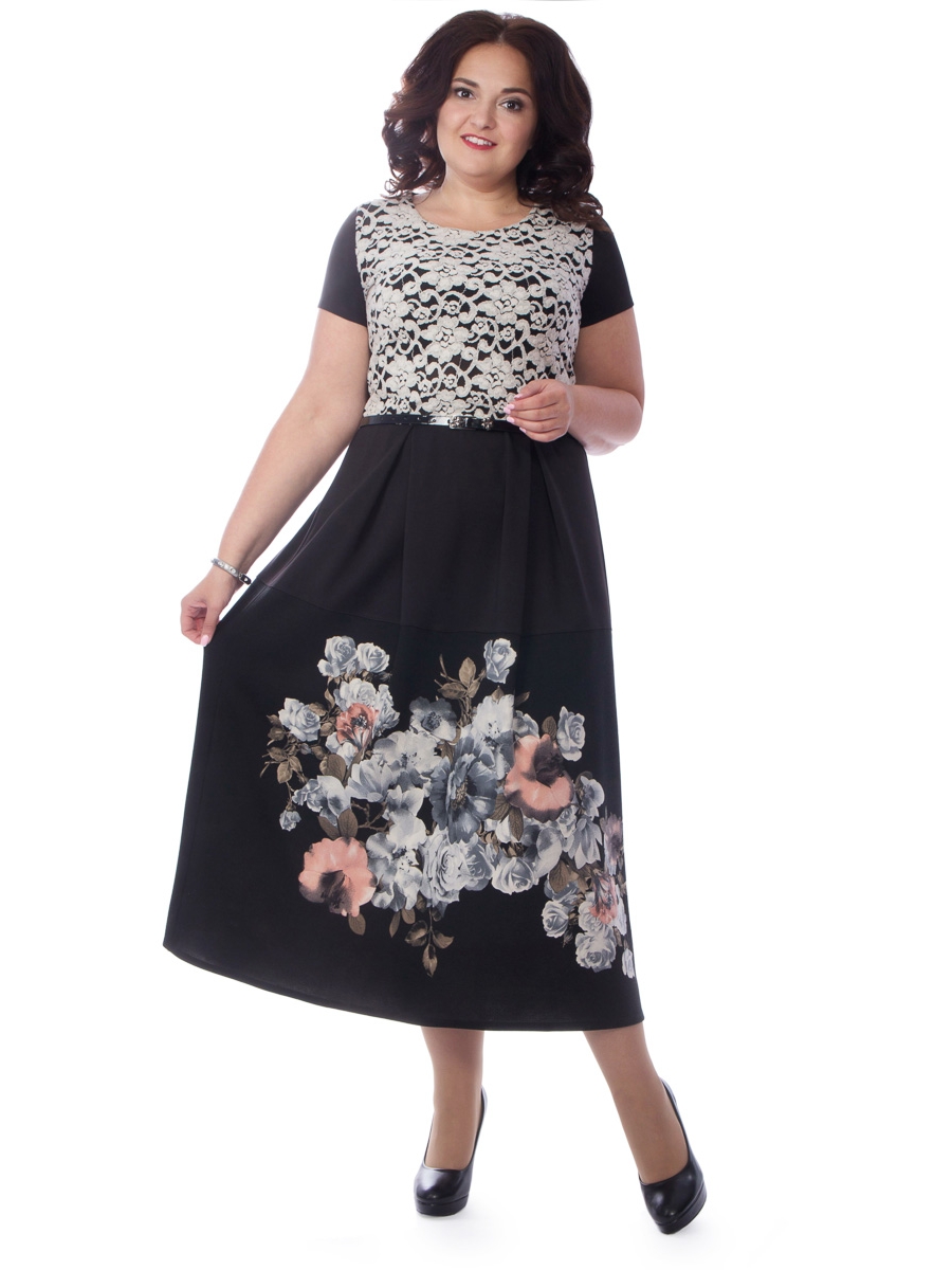 Стильное платье-макси полуприлегающего силуэта из трикотажного полотна черно-серого цвета с купронным рисунком. Круглый вырез изделия обработан обтачкой. Верхняя часть переда декорирована роскошным кружевом. Платье отрезное по линии талии. Юбка дополнена конструктивным горизонтальным швом и складками. По спинке изделия - потайная молния.