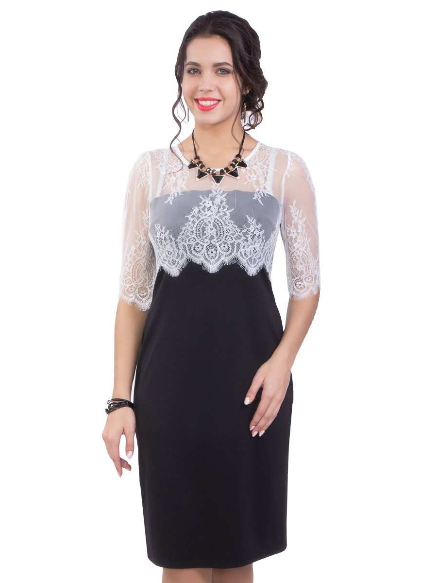 Элегантное платье прямого силуэта из трикотажного полотна черного цвета. Круглый вырез изделия обработан косой бейкой. Кокетка и втачные рукава выполнены из кружевного полотна белого цвета. Спинка изделия дополнена застежкой на молнию и разрезом по низу.