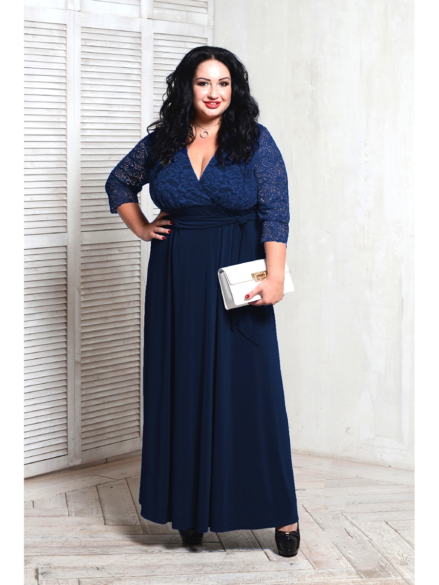 Элегантное длинное вечернее платье из легкого трикотажа с кружевом и рукавом 3/4.