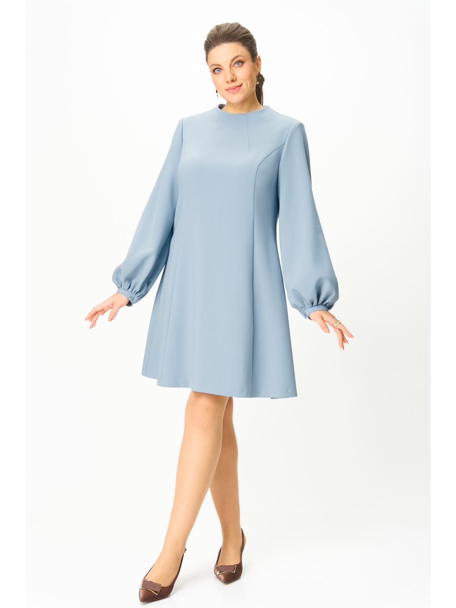 Стильное женское платье из плательной ткани с содержанием вискозы. Платье «А» образного силуэта с рельефными швами по переду и спинке. Горловина круглая с цельновыкроенной стойкой. Застежка на тесьму молния в центральном шве спинки. Рукава втачные, со сборкой по низу, на узком манжете с застежкой на петлю и пуговицу. Платье без подкладки.