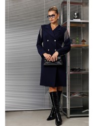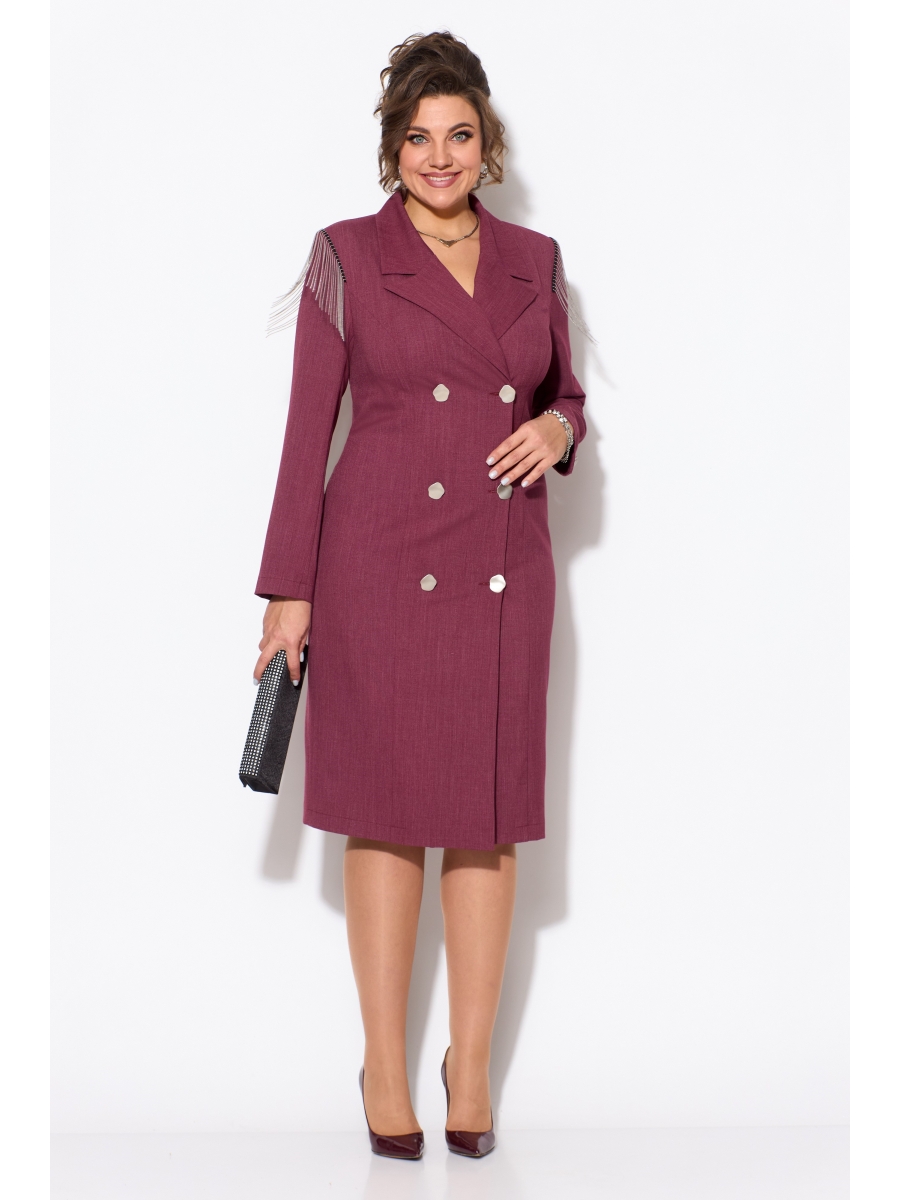 Платье женское из текстильной ткани двубортное, полуприлегающего силуэта. По полочке и спинке прилегание создается за счет рельефов, выходящих из проймы. По спинке - средний шов, переходящий в шлицу. Вороник пиджачного типа. Застежка на петли и пуговицы. Рукав втачной двухшовный со шлицей и пуговицами. По окату рукова отделка в виде металлезированной бахромы.