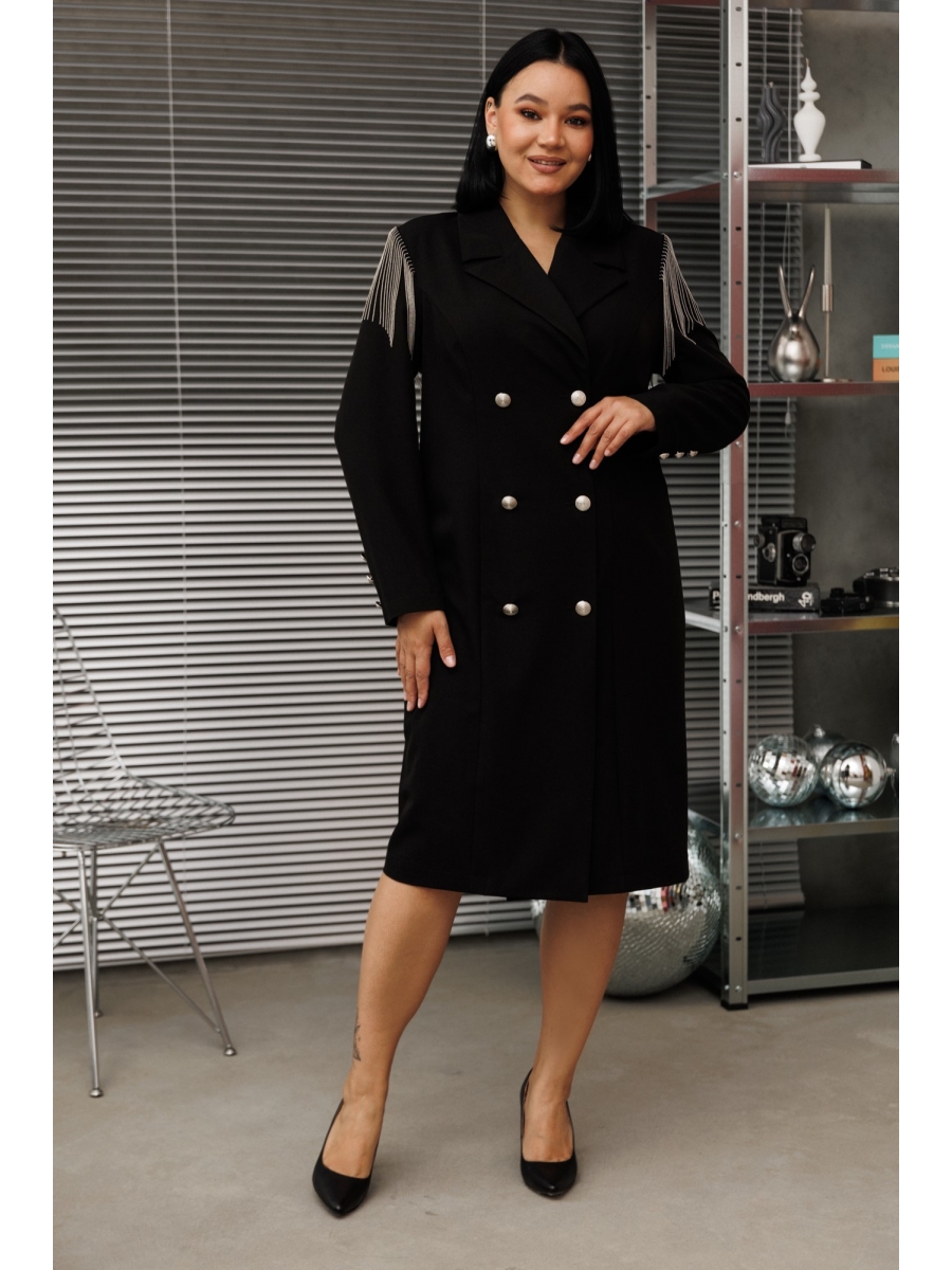 Платье женское из текстильной ткани двубортное, полуприлегающего силуэта. По полочке и спинке прилегание создается за счет рельефов, выходящих из проймы. По спинке - средний шов, переходящий в шлицу. Вороник пиджачного типа. Застежка на петли и пуговицы. Рукав втачной двухшовный со шлицей и пуговицами. По окату рукава отделка в виде металлизированной бахромы.