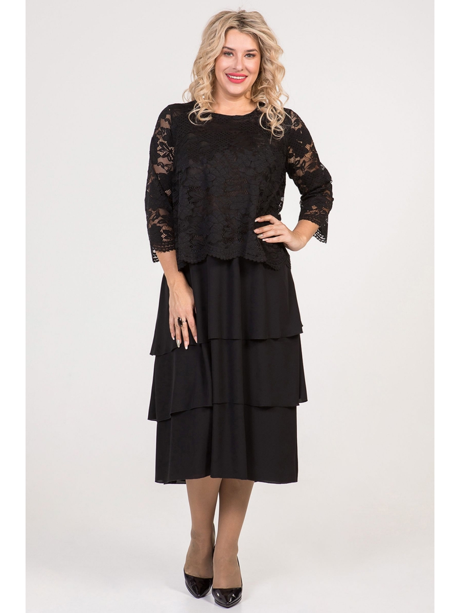 Оригинальное многослойное платье А-силуэта из двух видов тканей. Перед и спинка из кружевного полотна на подкладе. Круглый вырез горловины обработан изнутри. Втачные кружевные рукава длиной 3/4. Юбка спинки и переда выполнена из шифона в три асимметричных слоя. Низ ровный. Крой платья отлично подойдет дамам с любым типом фигуры. Платье отлично будет смотреться в торжественной обстановке.