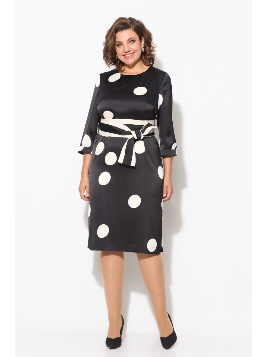 Нарядное женское платье из плательной ткани средней плотности с добавлением шелка, на трикотажной подкладке. Силуэт прямой, длина чуть ниже колена, вырез горловины круглый с застежкой на навесную петлю с пуговицей по спинке, в боковых швах невысокие разрезы, рукав ¾ на манжете с фигурным вырезом в виде капли. Пояс сьемный из аналогичной ткани с дизайном в широкую полоску.