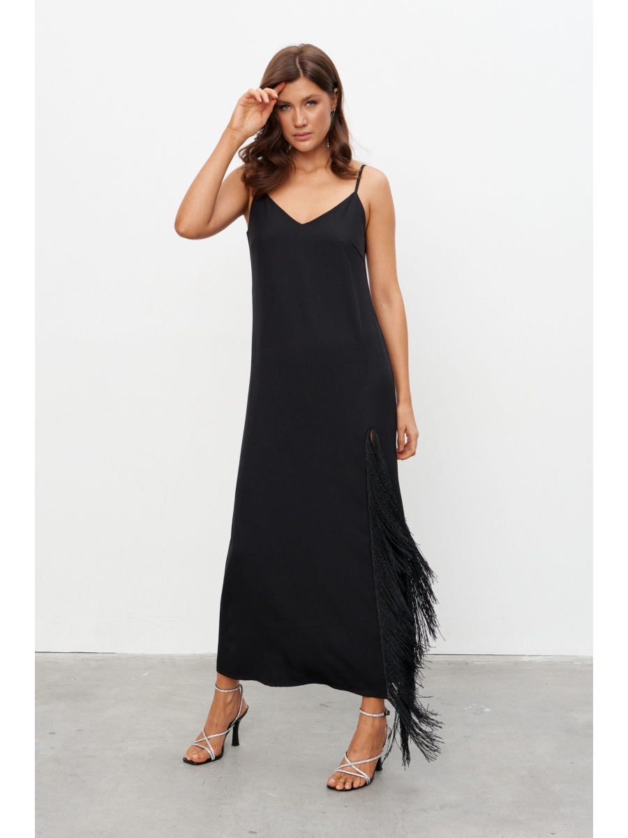 Оформить заказ →Платье-комбинация из струящейся ткани длиной макси с высоким разрезом, обрамлённым бахромой. Платье на бретелях длину которых можно регулировать. Застёжка на потайную молнию сбоку.