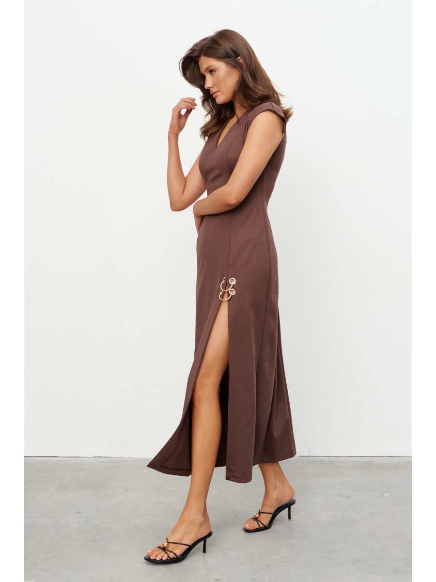 Платье из трикотажного полотна приталенного силуэта с расклешённой юбкой с высоким разрезом. Вырез горловины V-образный. По плечам - плечевые накладки. Верх разреза отделан люверсами и кольцами в качестве декора. Застёжка на потайную молнию сзади.