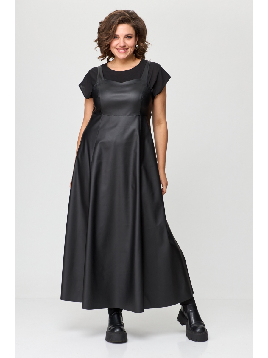 Оформить заказ →Платье двухслойное, длиной макси, выполнено из однотонной экокожи, в качестве отделки использована однотонная ткань в цвет экокожи. Верхняя часть платья выполнена в виде сарафана. Сарафан отрезной чуть выше линии талии. Полочка лифа сарафана с вертикальными рельефами, горловиной V-образной формы. Спинка лифа с вертикальными рельефами. Лиф на бретелях. Нижняя часть лифа в виде блузки с цельнокроеным рукавом. Полочка с нагрудными вытачками и горловиной круглой формы. Спинка с талиевыми вытачками. Нижняя часть платья – юбка формы “колокол”, состоящая из центральных и боковых частей. В левом боковом шве обработана потайная молния, в нижней части боковых швов разрезы.