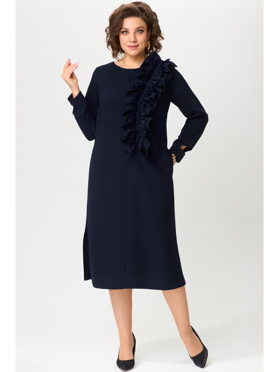 Платье свободного силуэта из костюмно-плательной ткани. Горловина округлой формы со стойкой. Перед платья с застежкой на молнию в среднем шве и нагрудными вытачками. Платье украшает декоративная съемная рюша на пуговицах. Спинка со средним швом. В боковых швах обработаны функциональные карманы, а по низу платья - разрезы. Рукав втачной длинный, по низу манжета с застежкой на петлю и пуговицу.