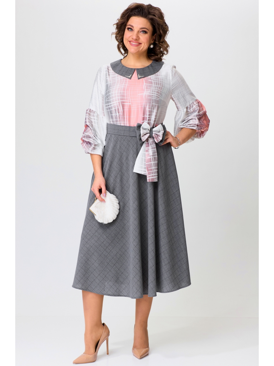 Платье из двух видов ткани полуприлегающего силуэта, расклешенное книзу. Воротник отложной плосколежащий, декорирован бусинами. Платье отрезное по линии талии. По переду обработаны нагрудные вытачки. Спинка с застежкой молнией в среднем шве. Рукав втачной длинной 3/4, на резинке понизу, с горизонтальным подрезом и с защипами. В боковых швах расположены карманы. Особый шарм платью придаст пояс из основной ткани, декорированный бантом.