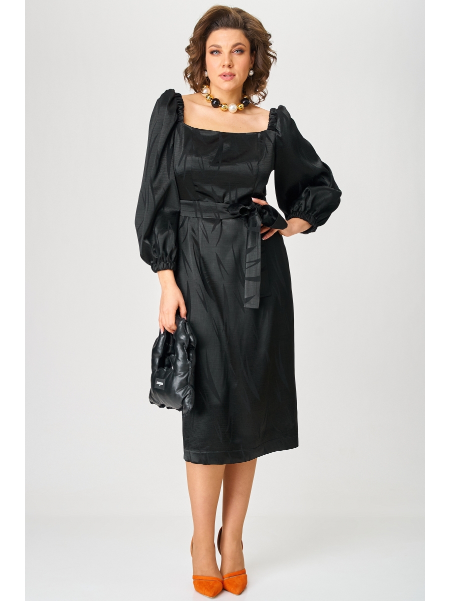 Платье приталенного силуэта, чуть ниже колена из костюмно-плательной ткани. Вырез горловины квадратной формы. Отрезное по линии талии. Перед и спинка с рельефами. По спинке средний шов, в котором вставлена потайная молния, внизу разрез. Рукав втачной широкий длинный, по окату собран на резинку. Длинный рукав легко превратить в три четверти с помощью резинки, вставленной по низу рукава. В комплект входит пояс из основной ткани.