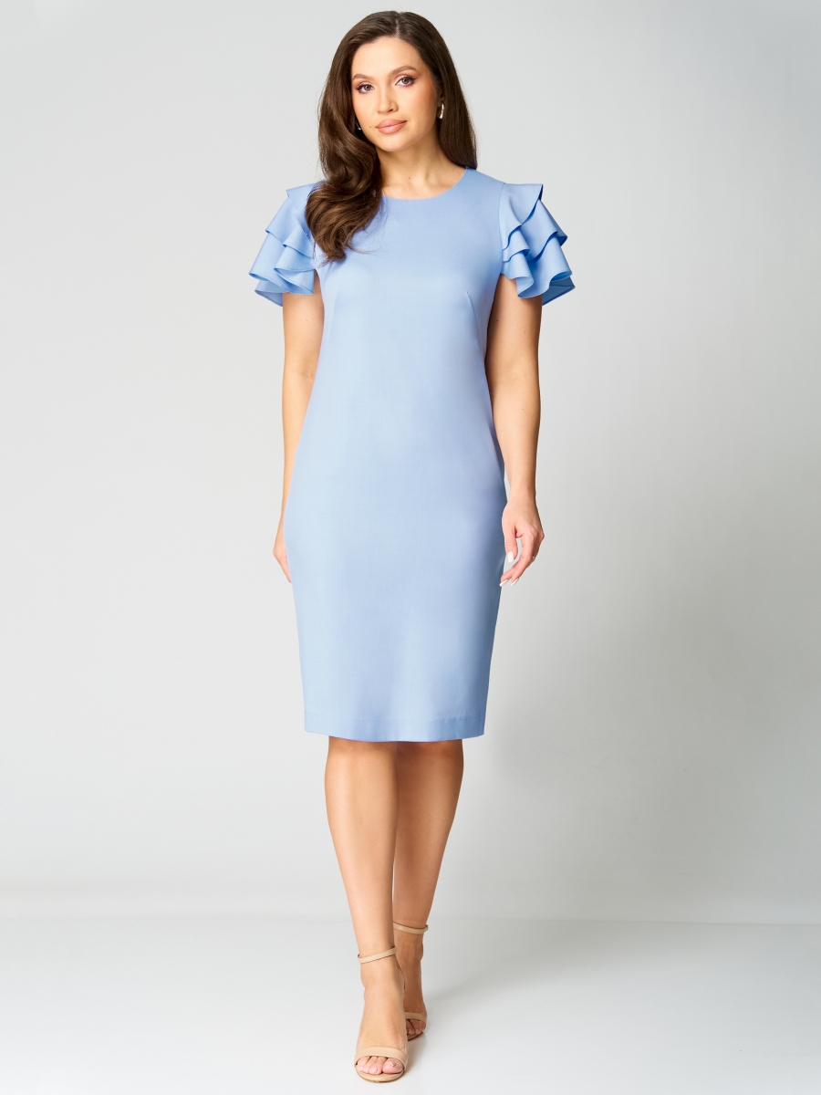 Платье полуприлегающего силуэта выполнено из лена вишера. Горловина округлой формы, на обтачке. По переду нагрудные вытачки выходящие из бокового шва. Спинка со средним швом, талиевыми вытачками и разрезом по низу. Застегивается на потайную тесьму-молнию. Рукава крылышки.
