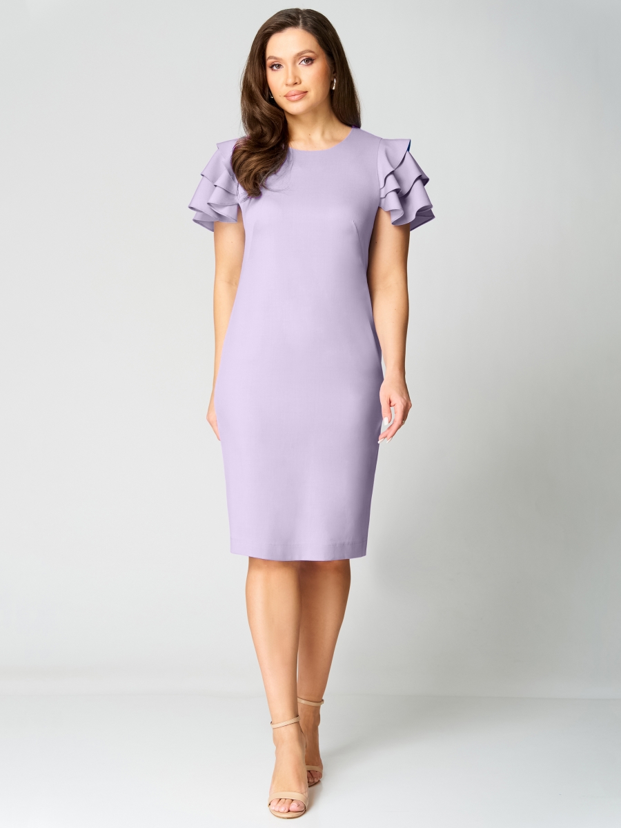 Платье полуприлегающего силуэта выполнено из лена вишера. Горловина округлой формы, на обтачке. По переду нагрудные вытачки выходящие из бокового шва. Спинка со средним швом, талиевыми вытачками и разрезом по низу. Застегивается на потайную тесьму-молнию. Рукава крылышки.
