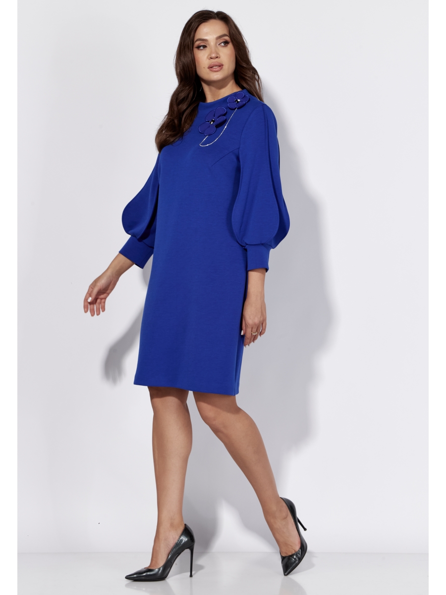 Оформить заказ →Платье женское, А-силуэта с втачным рукавом, длинной 3/4. Рукав фантазийной формы, типа "фонарик" состоящий из четырех деталей. Швы рукава отстрочены стройкой "на ребро". По переду нагрудные вытачки из пройм. Горловина оформлена расширенной мягкой строчкой. Декором служит съемное украшение.