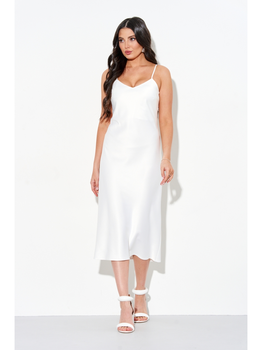 Платье - миди прилегающего силуэта выполнено из струящегося шелк - сатина, на регулируемых бретелях.