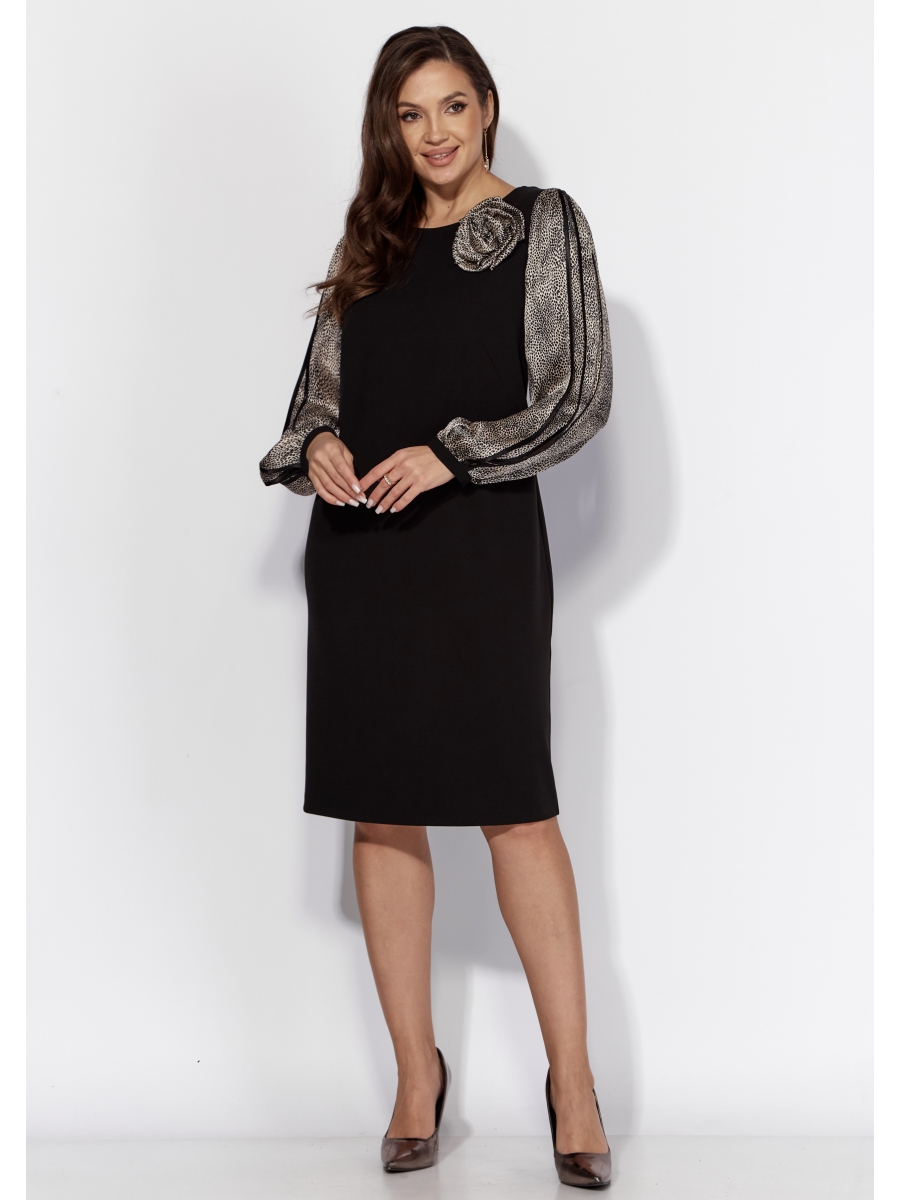 Платье женское, полуприлегающего силуэта с длинным втачным рукавом. Низ рукава присобран на манжету. По центру рукава вертикальные подрезы, оформленные контрастной окантовкой. По переду наклонные нагрудные вытачки. Вырез горловины круглой формы. Декором служит съемная брошь-цветок. По спинке средний шов с застежкой на потайную тесьму "молния" и разрезом по низу.