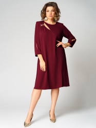 Нарядное платье А-силуэта, без подкладки. Округлый вырез горловины обработан бейкой. Перед с фигурным подрезом и разрезом по низу. По правой стороне переда легкая драпировка с декоративной пряжкой и двумя вырезами. Рукав втачной, двухшовный с вертикальным разрезом в локтевом шве. Спинка со средним швом и застежкой сзади на потайную тесьму-молнию.