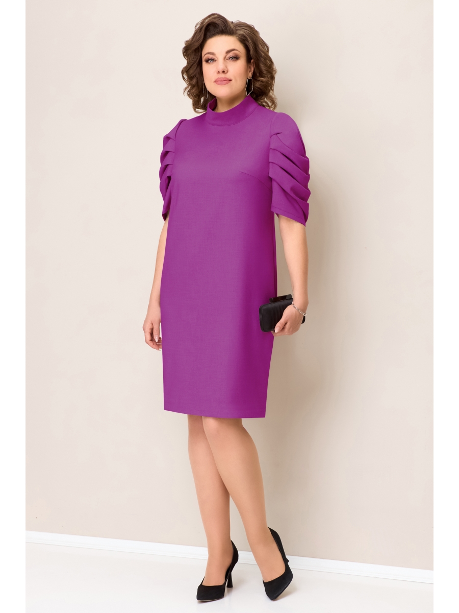Оформить заказ →Нарядное платье из текстиля прилегающего силуэта с объемными рукавами со складками. Горловина платья - полустойка. По спинке изделия - застежка на молнию и шлица.