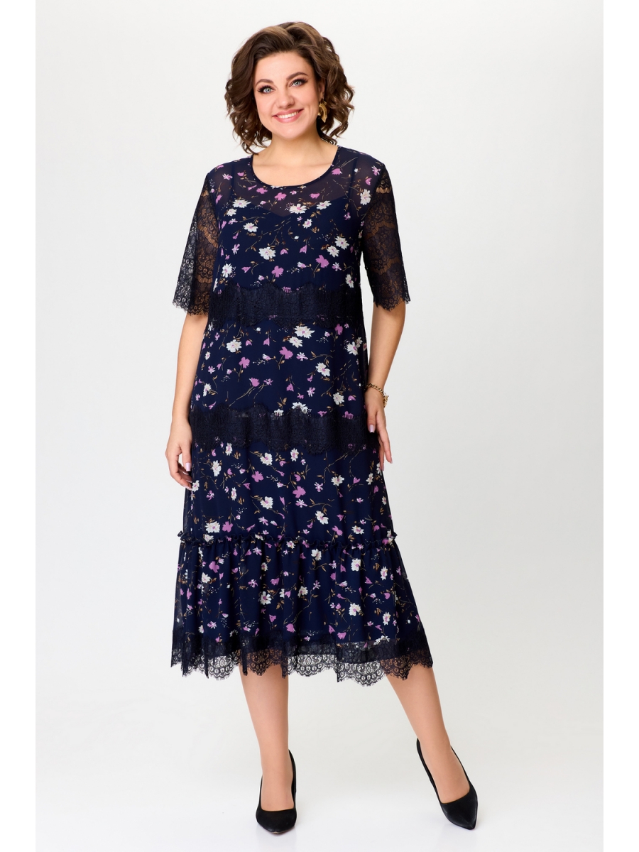 Верхнее платье А-силуэта из шифона с втачным рукавом. По низу платья широкая отделочная деталь со сборкой. Рукава платья выполнены из гипюра. Низ платья и каждый ярус декорированы гипюром.