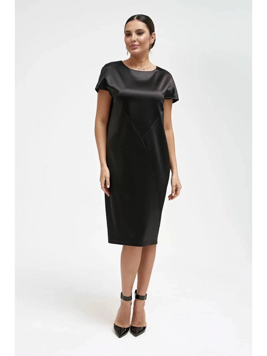 Платье свободного силуэта длины миди выполнено из плотного шелк-сатина, который держит форму за счет конструктивных линий. Платье с цельнокроенными рукавами и немного углубленным вырезом проймы, спинка со средним швом и кокеткой.