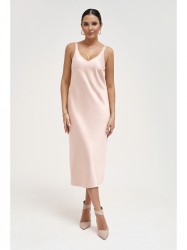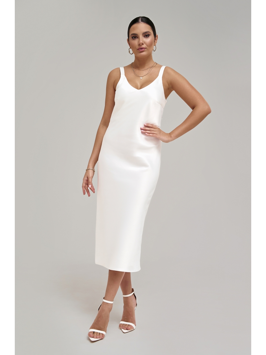 Женское шелковое платье-комбинация на бретелях длины миди. Платье выполнено "по косой" из плотного, держащего форму шелк-сатина без подкладки. В бокой шов вшита потайная молния.