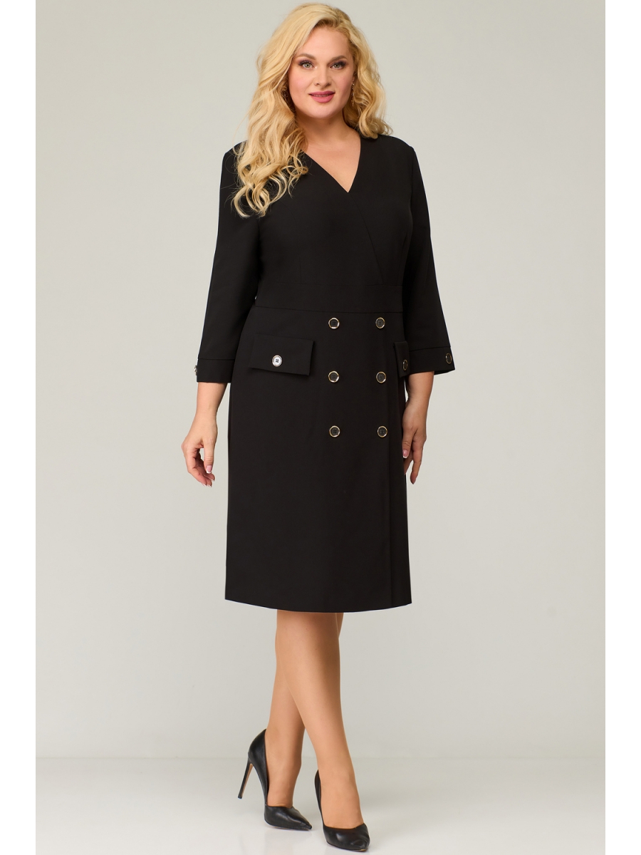 Платье женское полуприлегающего силуэта, рсширенное к низу, с втачным рукавом. Горловина v- образной формы, с имитацией запаха. Платье по переду отрезное по линии талии. Спинка со средним швом. В левом боковом шве обработана застежка на потайную тесьму – молнию. Передняя часть выполнена с имитацией застежки на пуговицы и декоративными клапанами. Рукав длиной ¾, с притачной манжетой.