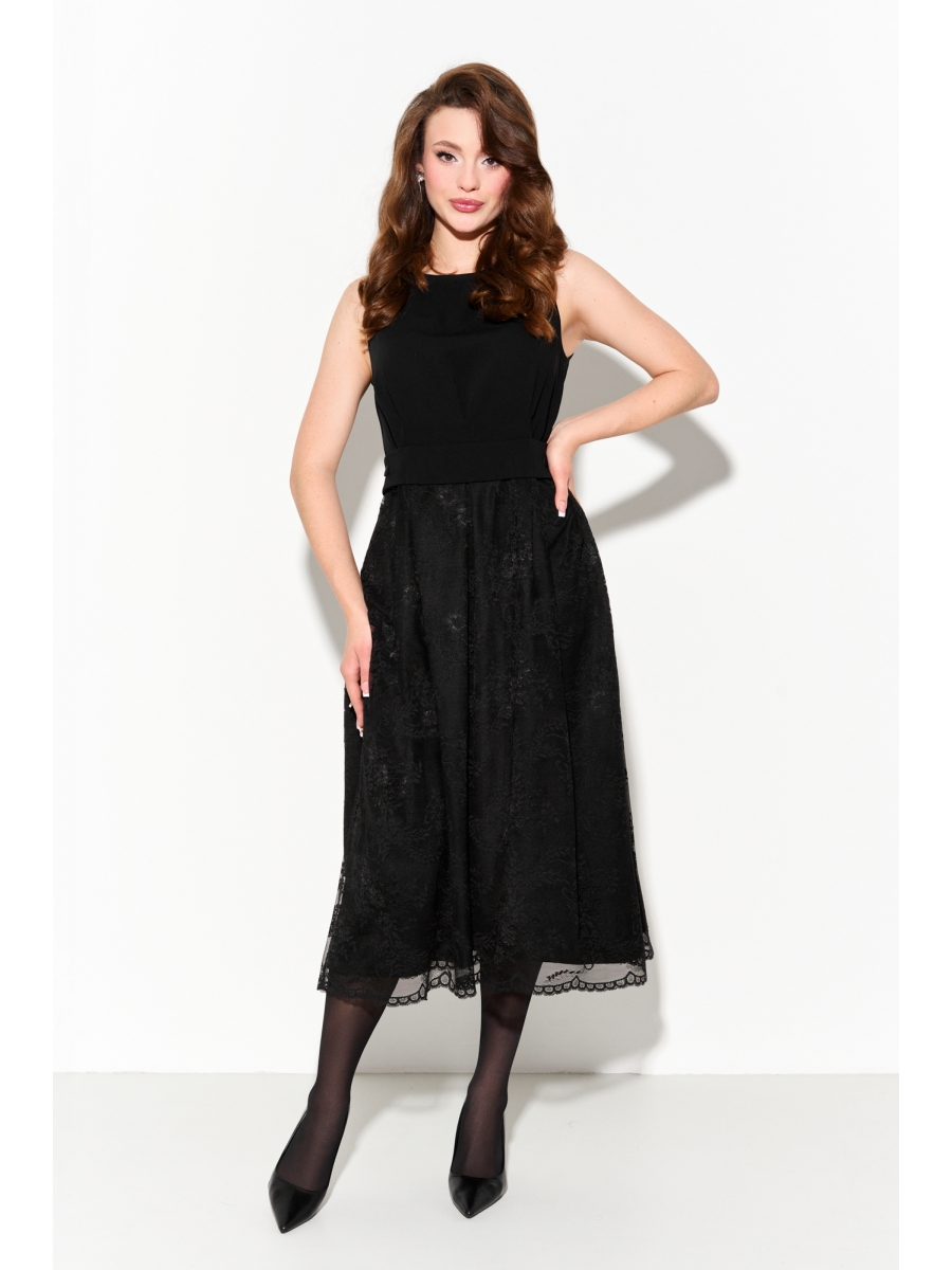 Женское нарядное платье А-силуэта. Верхняя часть изделия выполнена из плательной ткани, нижняя часть - из французского кружева на подкладке из крепа. На линии талии, спинке и по переду платья находятся складки с настрочным (не съемным) функциональным поясом, который застегивается на петли и пуговицы, регулируя линию талии. По спинке застежка на петлю и пуговицу. Платье полностью соответсвует заявленному размеру.