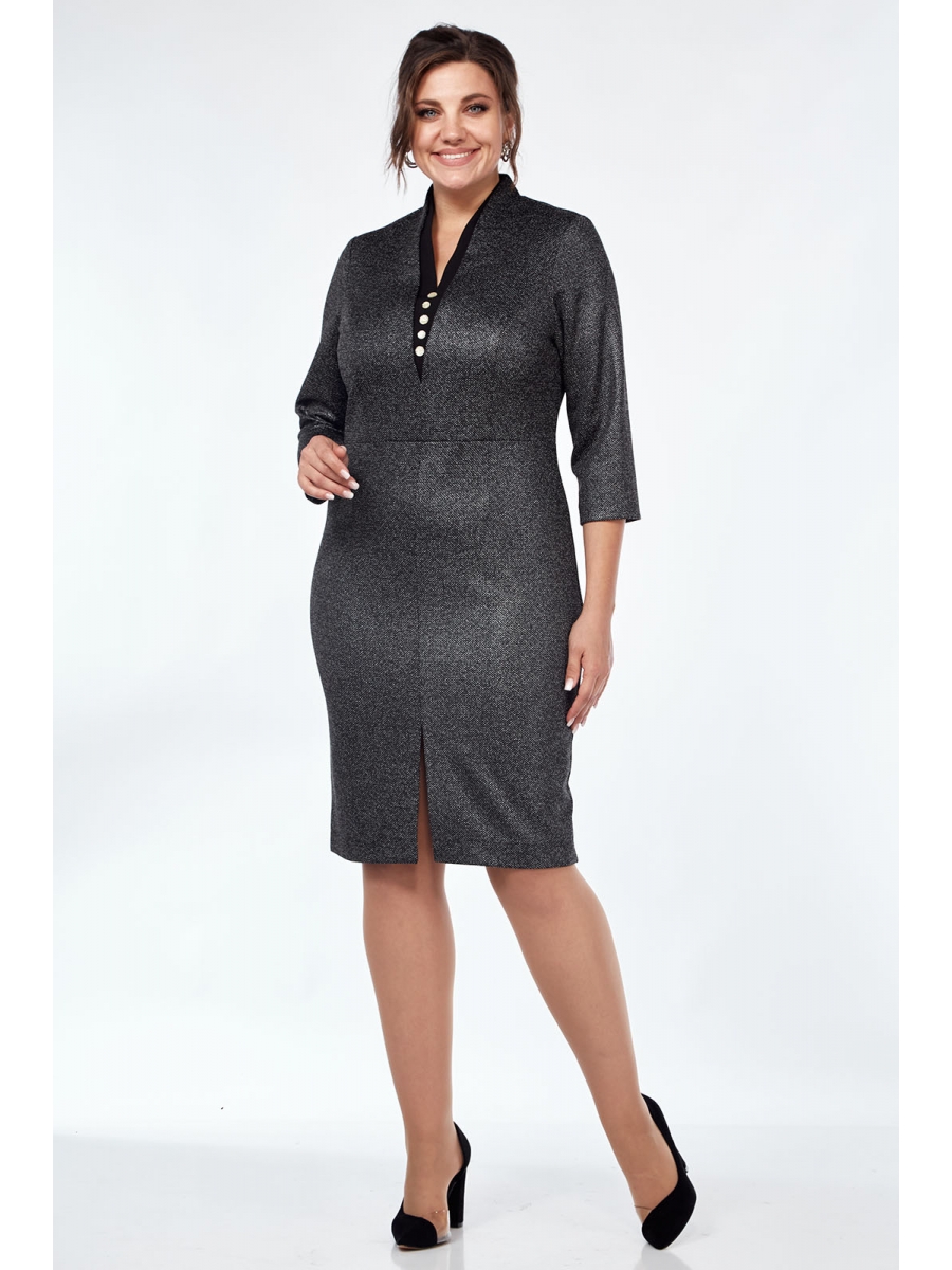 Платье полуприлегающего силуэта, с V-образным вырезом горловины. Перед отрезной по линии талии. Лиф с рельефами и отделочной деталью по горловине. Юбка с талиевыми вытачками и разрезом в среднем шве. В левом боком шве потайная застежка - "молния". Спинка с талиевыми вытачками и среднем швом. Рукава втачные, одношовные, длиной 3/4.