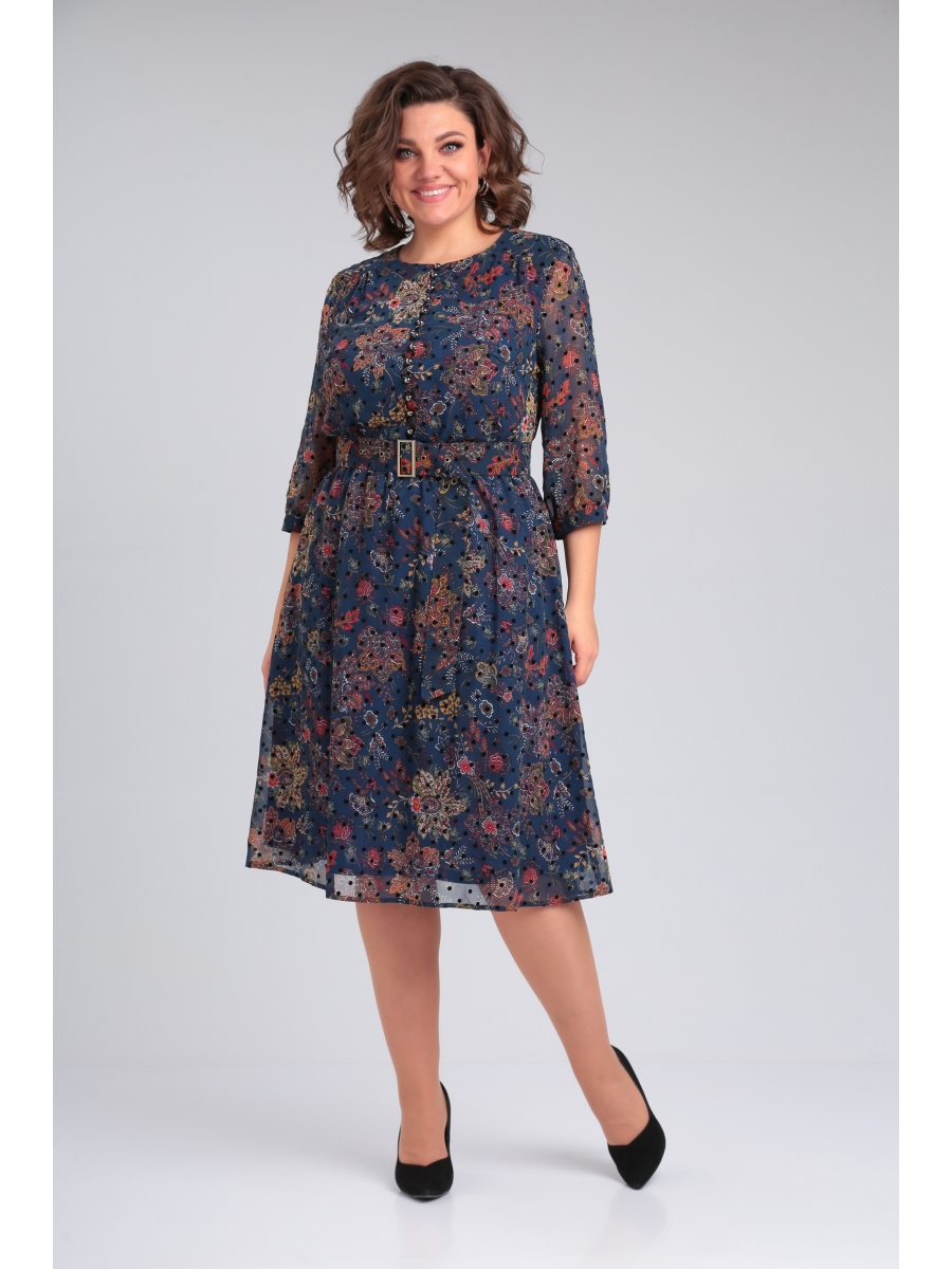 Платье женское из шифона на подкладке, отрезное по линии талии, на резинке. По переду полочки обработана застежка на навесные петли и пуговицы. Имеются отрезные кокетки со сборкой по лифу и нагрудные вытачки. Горловина округлой формы. Юбка слегка расклешена. Рукава одношовные, втачные, по низу рукавов сборка и притачная манжета, которая застегивается на одну пуговицу.