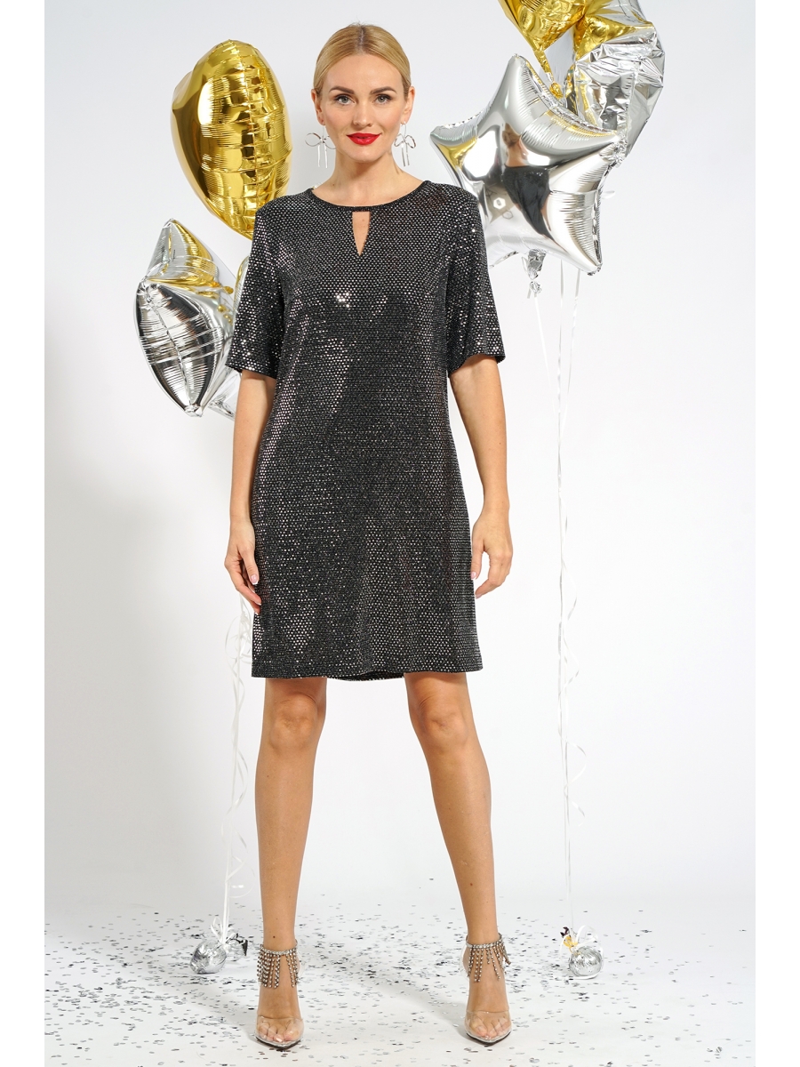 Оформить заказ →Платье силуэта А-образной формы. Перед с нагрудными выточками и с V-образным разрезом верх по горловине. Рукава втачные, одношовные, короткие. Горловина круглой формы обработана окантовочным швом.
