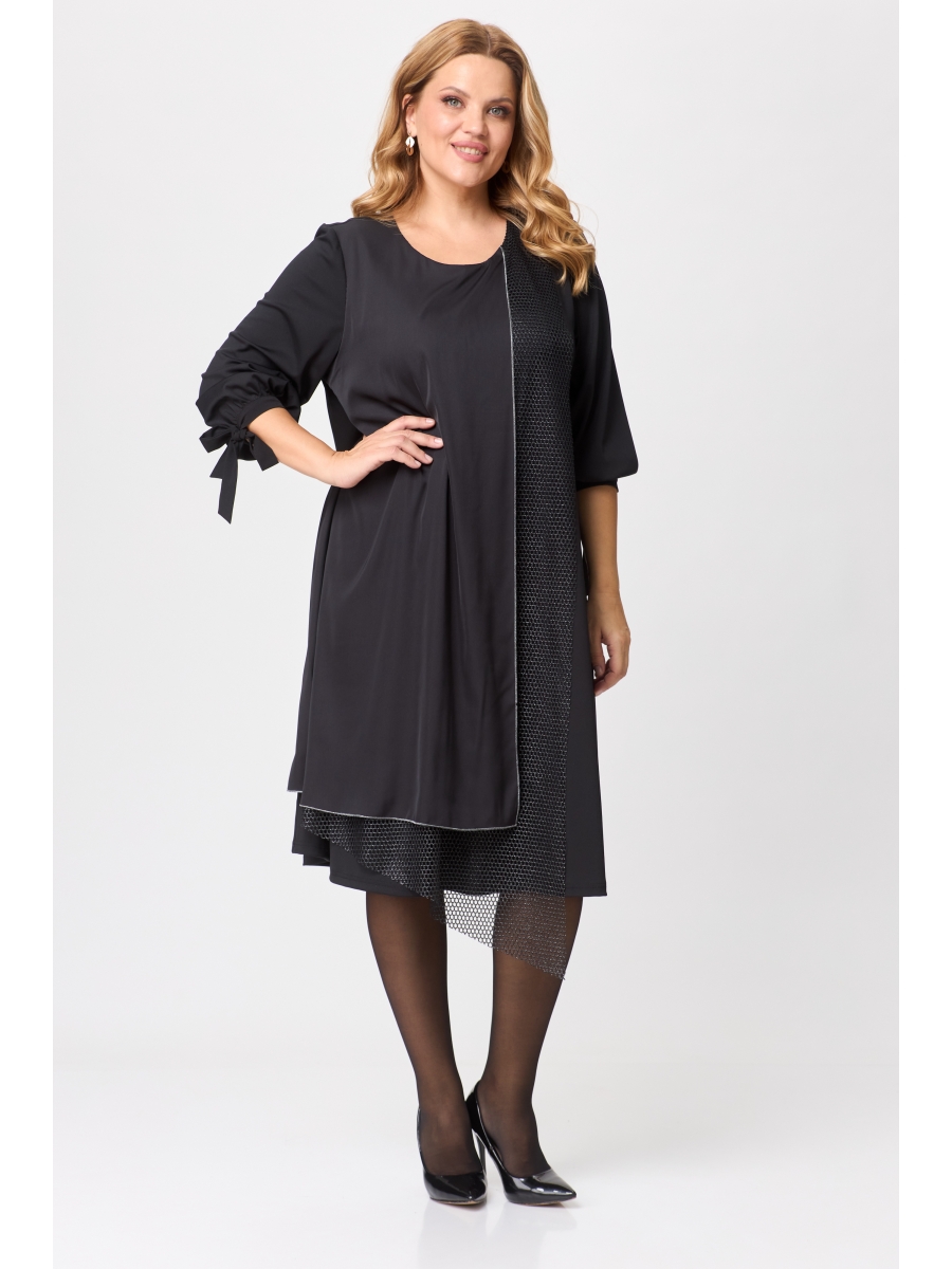 Нарядное платье из водолаза идеально подойдёт для любых торжеств. Изделие имеет трапециевидный силуэт. Платье длиной ниже колена с втачным рукавом 3/4 на притачной манжете с завязкой. По переду изделия две отлетные детали, которые украшают платье и делают его неповторимым (верхняя деталь из шифона с отделкой серебряной нитью, нижняя - сетка с серебром). Платье подчеркнет Ваши достоинства и не будет сковывать движения, прекрасно дополняется различными аксессуарами.