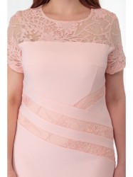 Платье, выполненное в красивых оттенках темно-пудрового с отделкой из кружевного полотна.