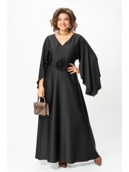 Платье женское вечернее полуприлегающего силуэта с расширением понизу. Вырез горловины v- образный. Застежка на потайную молнию в левом боковом шве. Платье отрезное по линии талии, нижняя часть переда и спинки расклешенная. Цельнокроеные рукава волнообразной формы добавляют романтичности и легкости. По линии талии съемный пояс с украшением ручной работы в виде цветка.