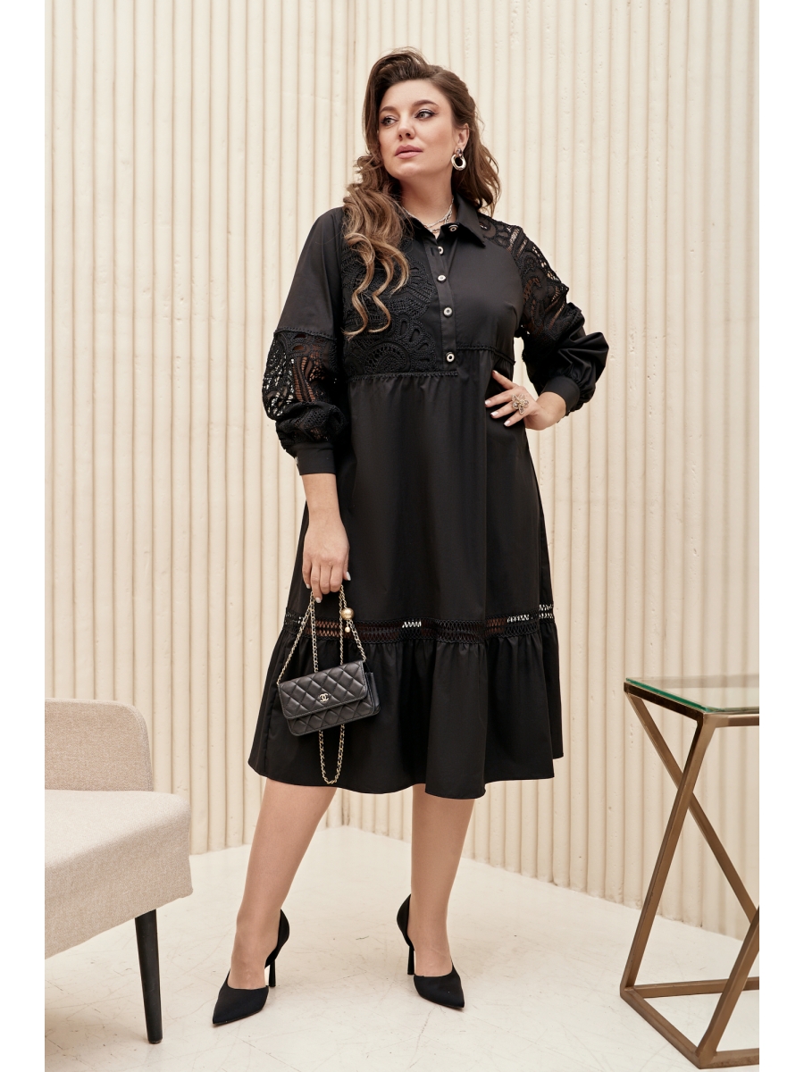Платье А-силуэта с ассиметричным подрезом по переду и действующей планкой на петли пуговицы и воротником рубашечного типа. Деталь полочки с элементом наложения из отделочной ткани. По низу платья притачной волан со вставкой из кружева в подрезе. Спинка с элементом наложения из отделочной ткани и подрезом выше уровня талии. Рукав втачной, длинный со сборкой на манжету с застёжкой на пуговицу. Рукав ассиметричный со вставками из отделочной ткани «на просвет». В качестве дополнительной отделки в подрезах платья идёт декоративная тесьма.