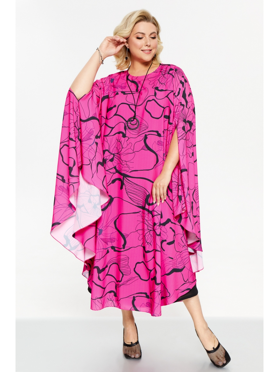 Объёмное платье-пончо с отдельным платьем-подкладкой. Вырез горловины округлый, прорези для рукавов в плечевых швах. Подкладка с глубокими вырезами горловины и пройм. Спереди нагрудные вытачки, на спинке средний шов.