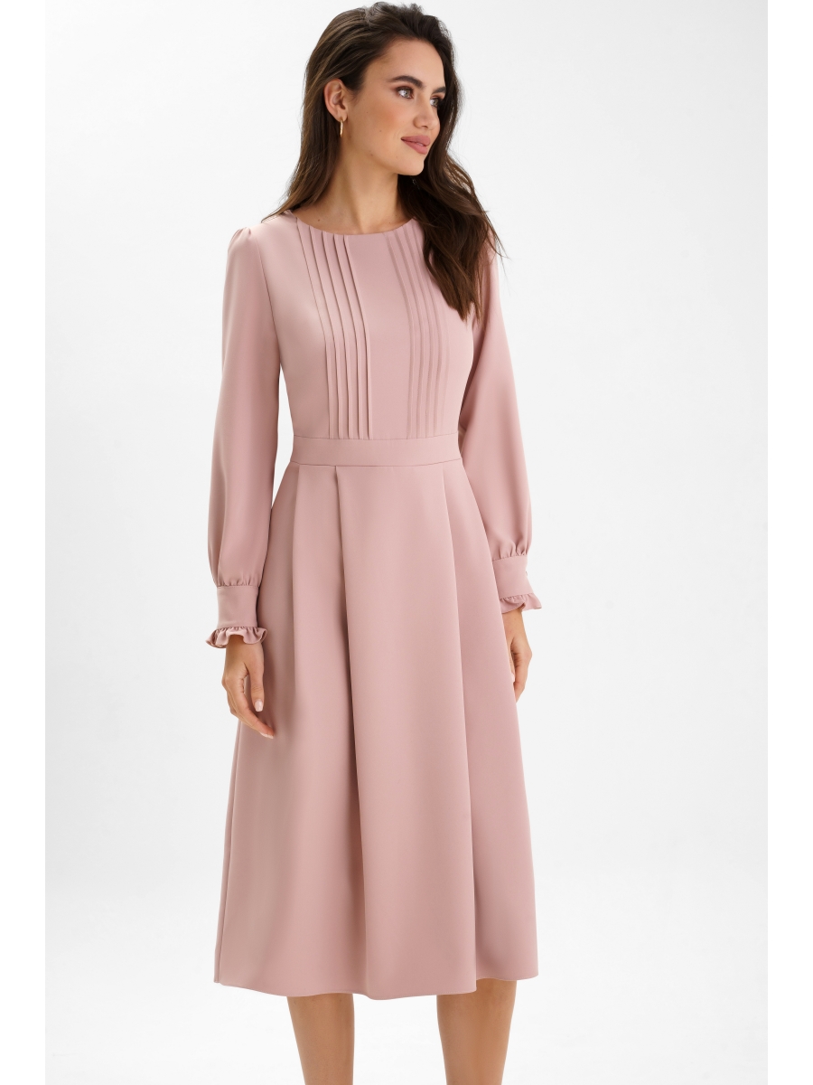 Лаконичный фасон и женственность – две важные особенности. Именно этими словами можно охарактеризовать это платье, которое будет актуально на любом мероприятии. Платье женское полуприлегающего силуэта из костюмно-плательной ткани, может быть как нарядным, так и для повседневной носки. Платье отрезное по линии талии, с притачным поясом. Верхняя часть переда (лиф) с защипами, идущими от горловины до шва притачивания пояса. Нижняя часть переда (юбка) с 2-я парами складок. Спинка со средним швом, в котором обработана застежка на потайную тесьму-молнию. Верхняя часть спинки с талиевыми вытачками, идущими от шва притачивания пояса. Нижняя часть спинки с 2-я парами складок. Рукава втачные, одношовные, длинные. По окату рукава имеется сборка. Низ рукава обработан притачной манжетой, застегивающейся на петлю и пуговицу, рукав по шву притачивания к манжете со сборкой. Манжета с закругленным углом. По нижней части манжеты - рюша. Горловина овальной формы, обработана обтачкой.