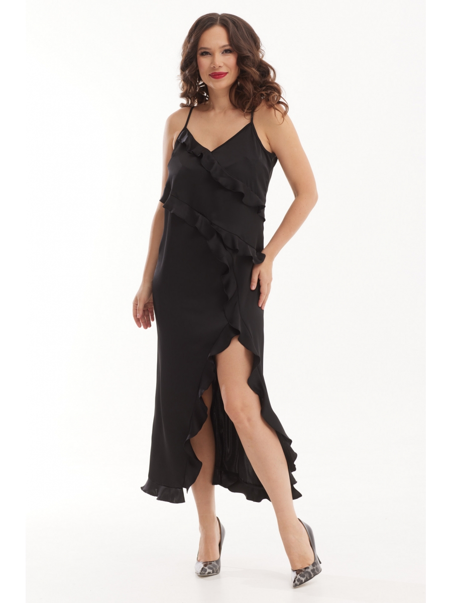 Нарядное платье-комбинация свободного прямого кроя с боковым разрезом. Выполнено из плательной ткани с атласным блеском. Платье на регулируемых тонких бретелях. Дополнено платья легкими воланами, выполненными из основной ткани.