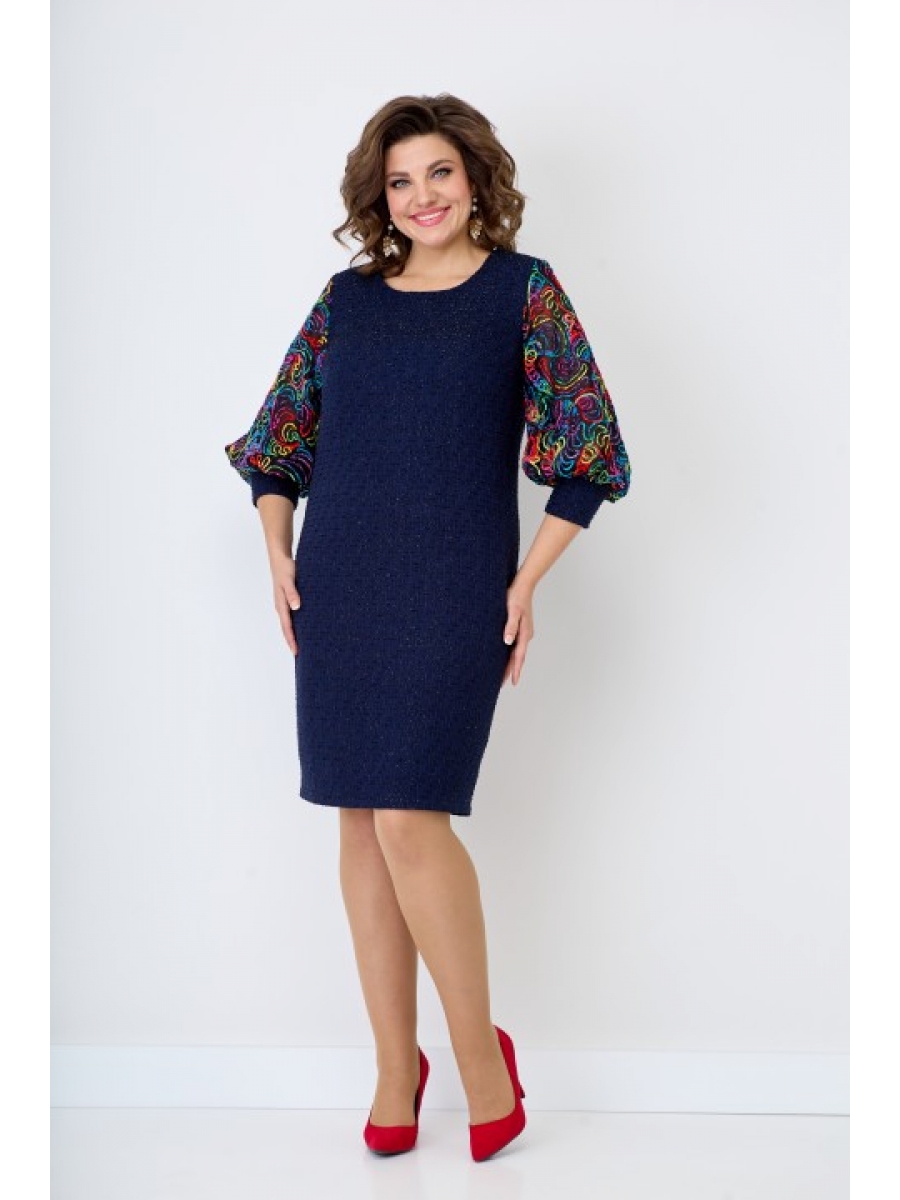 Женское, нарядное платье свободного кроя. По линии груди на полочке нагрудные выточки. Спинка со средним швом, переходящим в шлицу. Горловина-округлая. Рукав втачной, 3/4 выполнен из двойной сетки с красивой вышивкой, заканчивающийся манжетой из основной ткани. Нижняя часть сетки короче верхней, за счет чего дает пышность рукаву. Платье на подкладке.