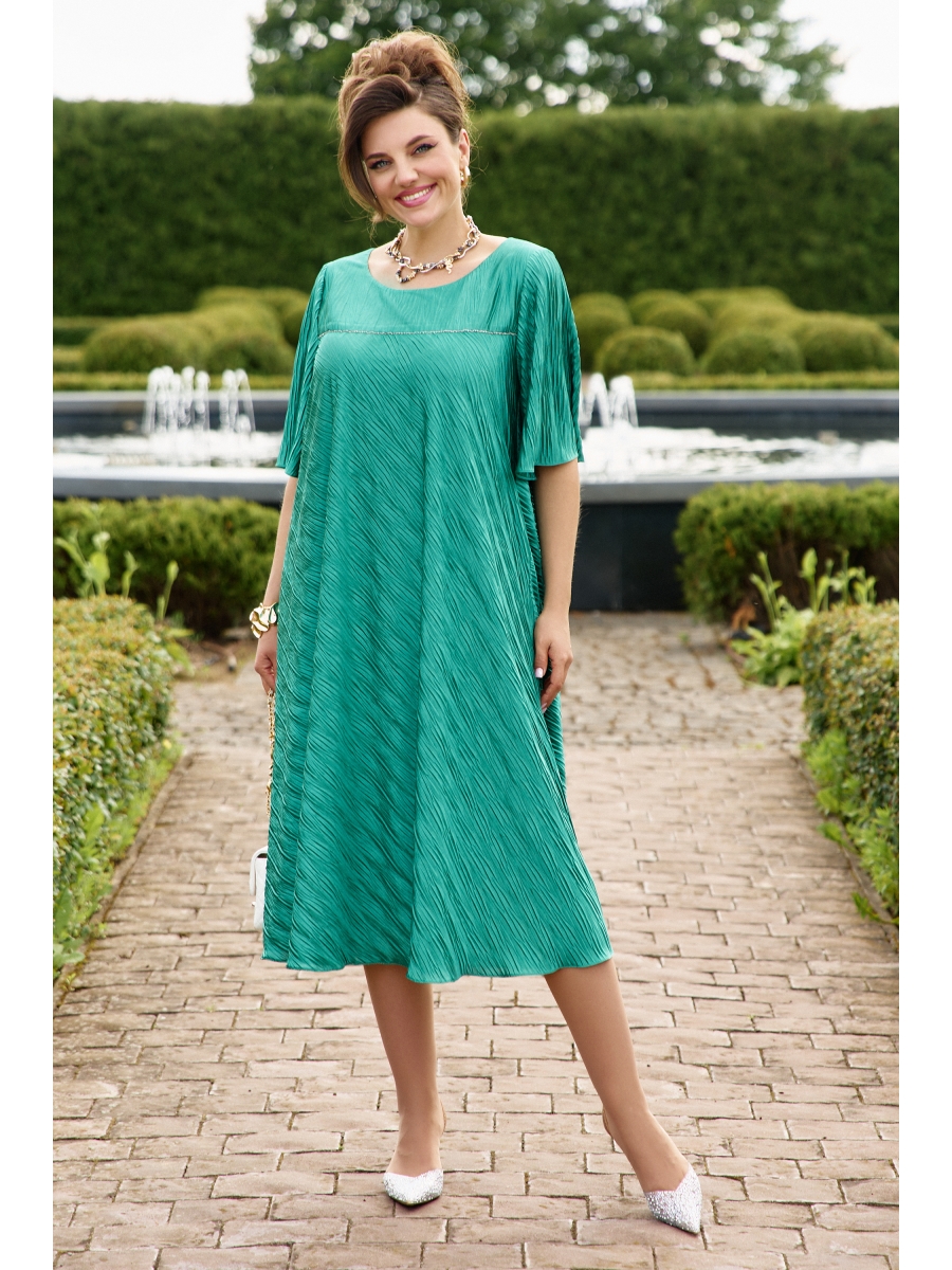 Сочный зелёный цвет платья подчёркивает изящество женской фигуры и придаёт образу нотку загадочности. Свободный трапециевидный крой обеспечивает комфорт и свободу движений, элегантно ниспадая по фигуре и деликатно скрывая ее изгибы. Горловина округлой формы, по переду платья отрезная кокетка со вставкой декоративной тесьмы в подрезе. Рукав втачной, расширенный к низу, длиной ¾. Спинка с отрезной кокеткой.