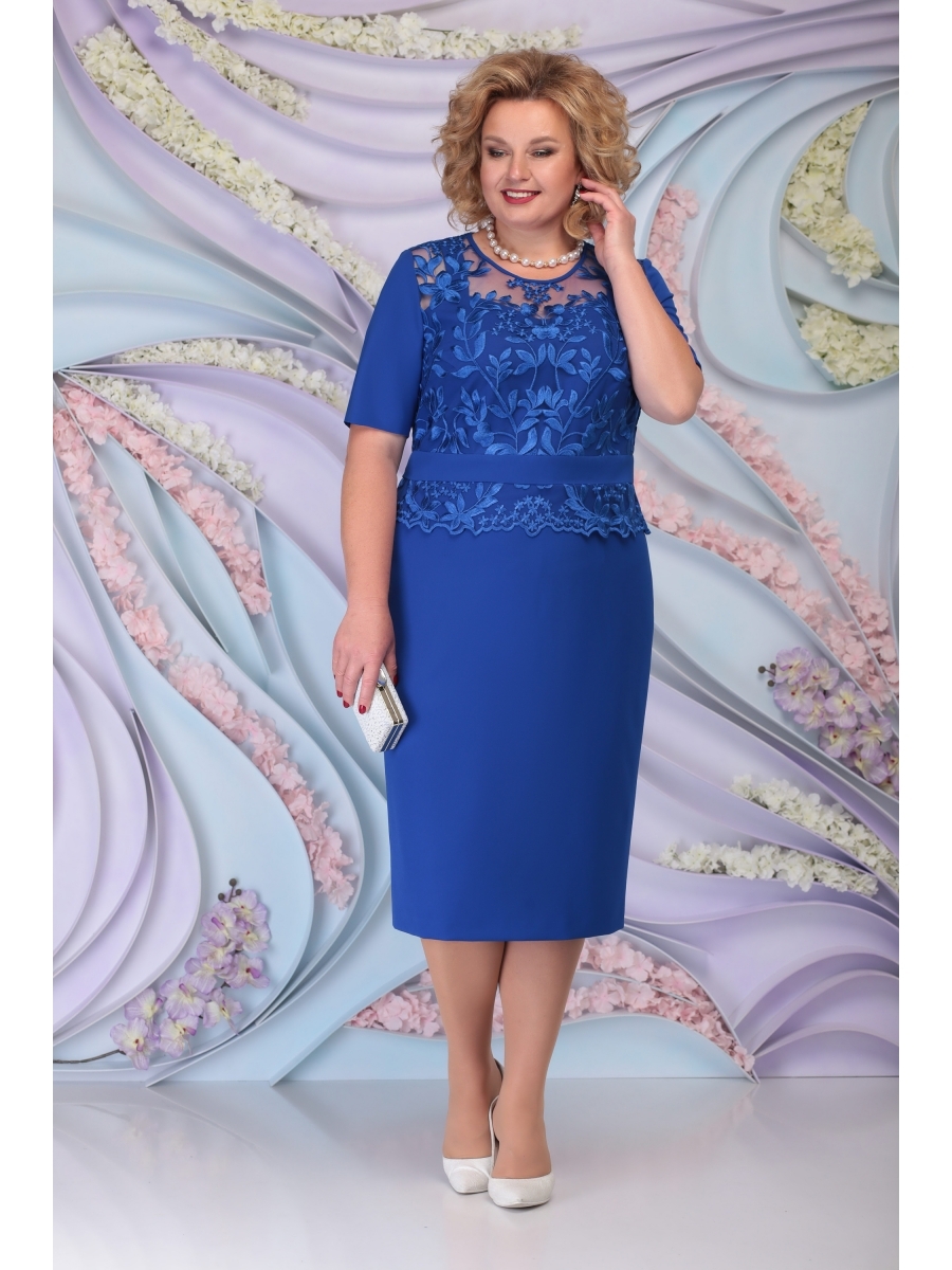 Платье женское, полуприлегающего силуэта, с отрезным поясом по линии талии, чуть зауженное к низу. Нижняя часть лифа с обрезанной плечевой частью, с обтачным вырезом декольте. В шов обтачивания декольте вставлены обтачные бретели, шириной 3,0 см частью. Верхняя часть двойная, нижняя часть из основной ткани, верхняя из гипюра. Нагрудные вытачки выходят из проймы. На нижней части спинки талевые выточки. Юбка с вытачками, на подкладке из дышащей, приятной на ощупь и достаточно эластичной ткани с баской из гипюра. Рукава втачные, одношовные. Горловина круглая, углублённая, окантованная. В среднем шве спинки обработана застёжка на потайную тесьму молнию и шлица.
