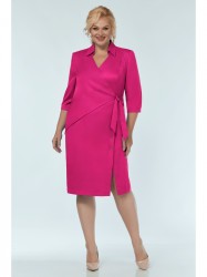 Нарядное платье полуприлегающего силуэта, выполненное из стрейчевой плательно-костюмной ткани. Ассиметричный крой в сочетании с яркой палитрой создаёт притягательный образ для праздничных событий. Перед платья с отлетной деталью на запах, завязывающейся на пояс; с левой стороны с рельефным швом от плеча, переходящим в декоративную шлицу с тремя пуговицами. Спинка со средним швом. Прилегание по талии можно регулировать за счёт пояса. Рукав втачной, двухшовный, длиной 3/4, с разрезом в локтевом шве, по низу с заложенными складками и манжетой на пуговице. Вырез горловины V-образный. Воротник стояче-отложной со стойкой.