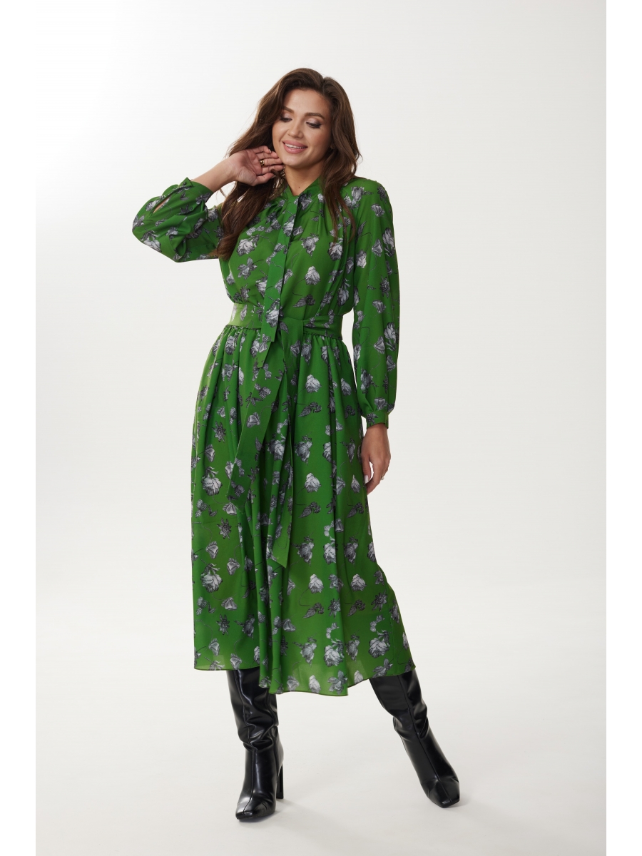 Платье отрезное по линии талии. Рукав реглан со сборкой по низу с застежкой на одну пуговицу. По переду из горловины декоративные складки. Воротник - стойка, переходящая в неширокий бант. Юбка со встречными складками по переду и спинке. По линии талии резинка.