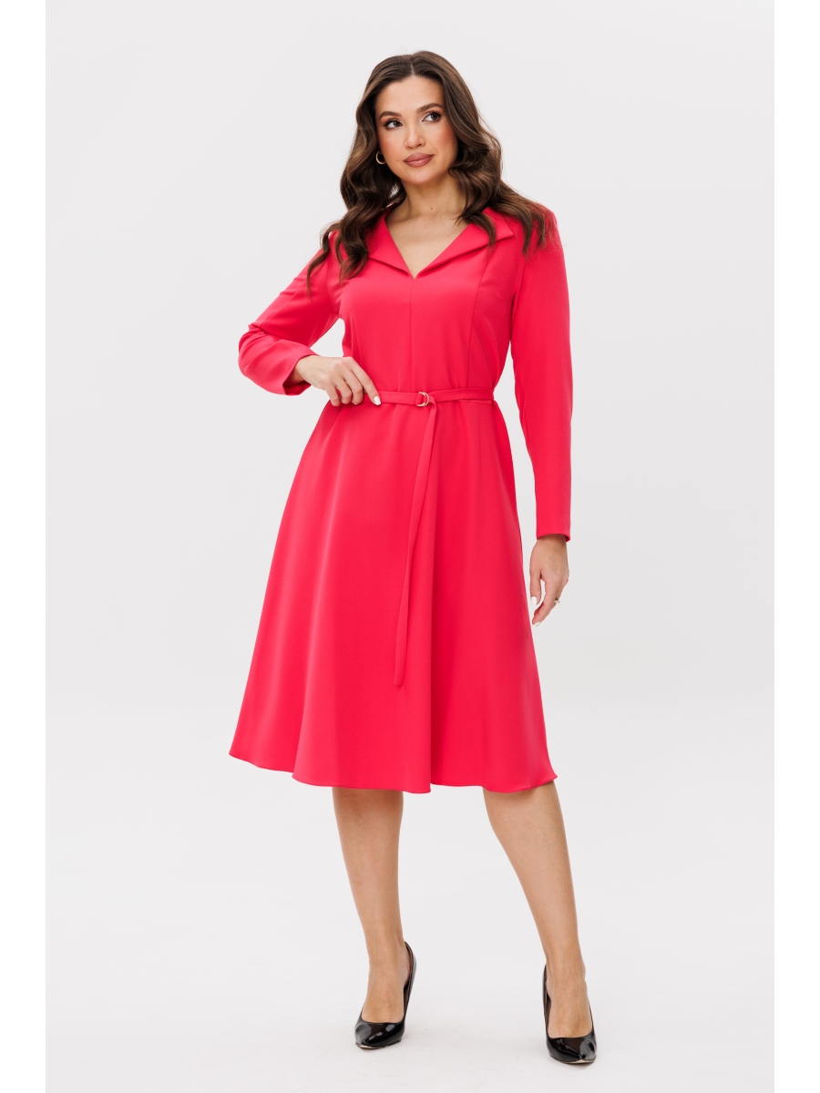 Модное платье длины миди - это идеальный выбор для любого торжества. Роскошное наполнение лаконичных форм - эта идея воплощена в необыкновенно женственном полуприлегающем силуэте лифа и романтичной конической юбке. Покрой - втачной, воротник - апаш, рукав - двухшовный. Полочки с центральным швом и вертикальными рельефами, лиф спинки как бы повторяет полочку. Нижняя часть платья - коническая. Модель дополнена съёмным поясом с пряжкой.